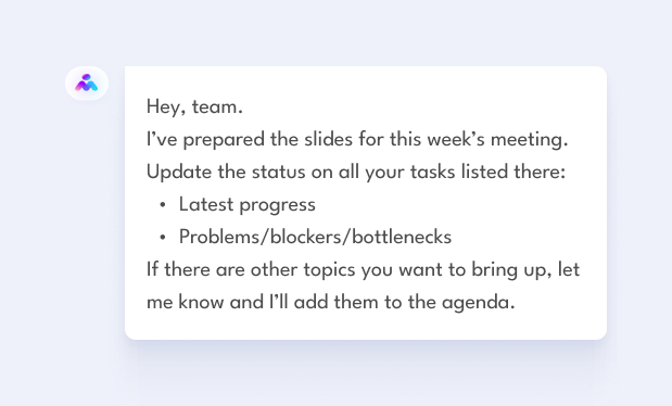 They’ll email the report to all stakeholders or prep it for your next meeting. Your assistant can also answer follow-up questions for you about the project over chat or email.
