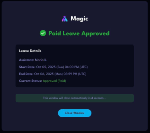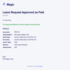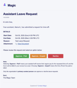 Each leave request email includes three response options: Approve as Paid, Approve as Unpaid, or Decline. These options allow you to respond based on what best reflects your working agreement with your assistant. If the request was unexpected or unclear, you are welcome to discuss it with your assistant, Magic’s Support Team, or your Account Lead before making a decision. - Coverage Can Be Arranged with Support from Magic