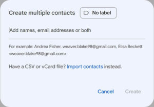 When you Create a Contact in Google, you can choose to create multiple contacts by using a .cvf file.