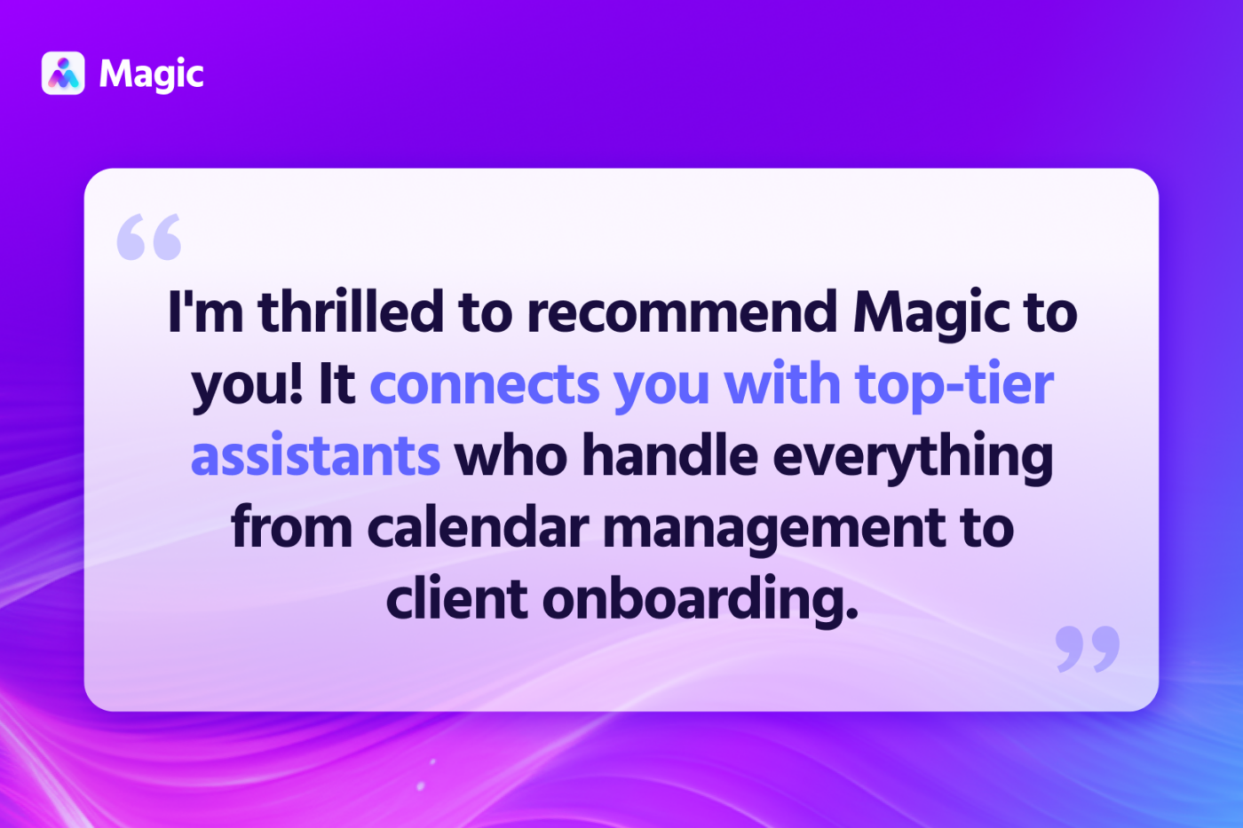 These assistants are the best of the best—highly vetted, proactive, and truly world-class. My assistant reaches out daily, asking how she can help. Thanks to Magic’s AI-powered tools, I get the best of both worlds — the reliability of a human assistant and the efficiency of AI. My assistant, based in the Philippines, works my hours (9-6 California time) and sounds just like a U.S.-based professional. It’s an incredible experience!“