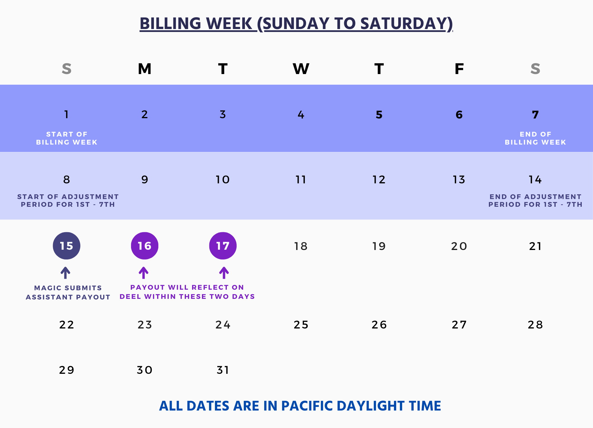 The billing week starts every Sunday at 12AM, Pacific Daylight Time (PDT), and ends on Saturday at 11:59PM PDT of the following week. Pay is processed 8 calendar days after the end of the billing week.