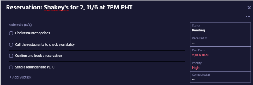 - Main task: Reservation: Shakey’s for 2, 11/6 at 7PM PHT