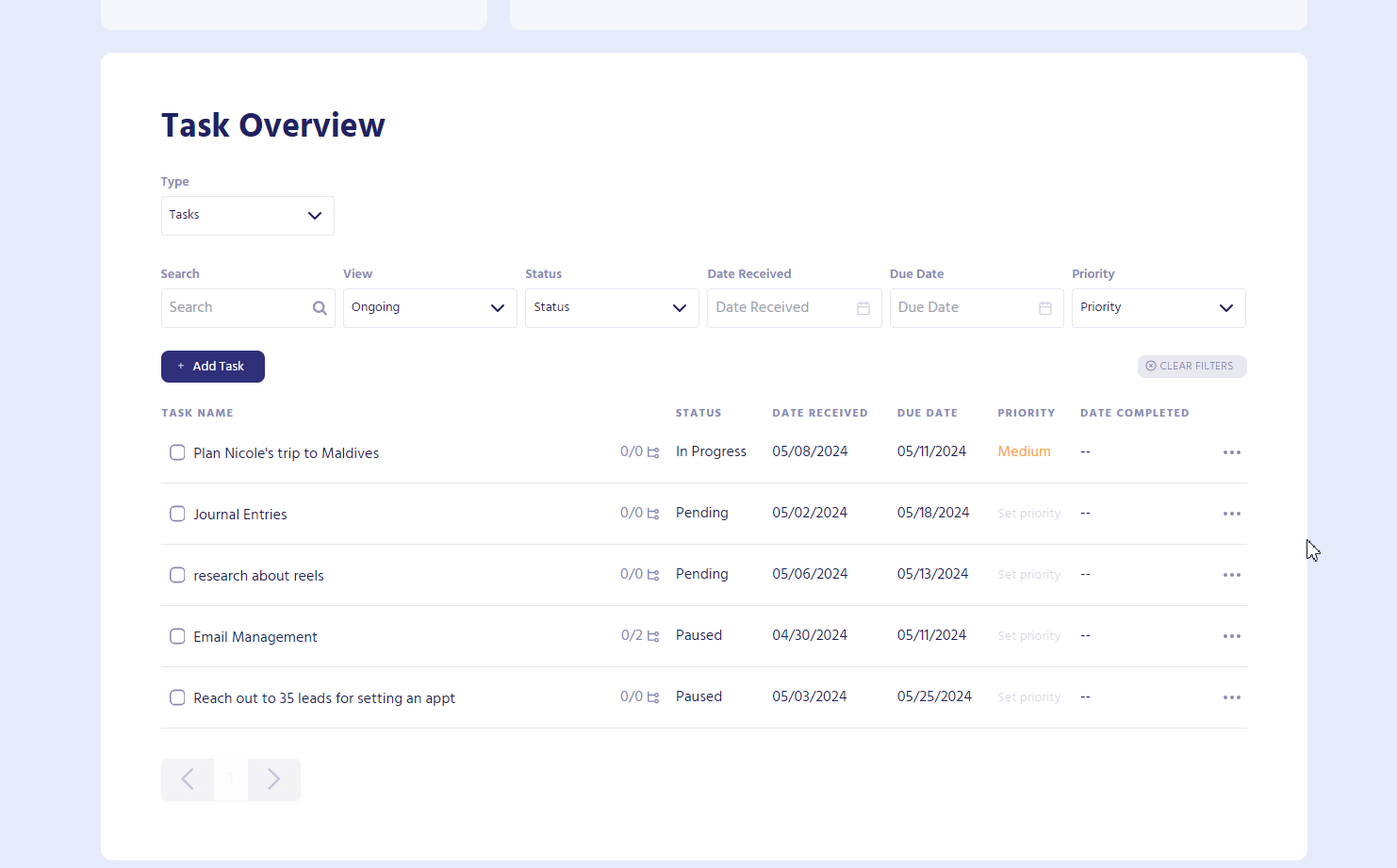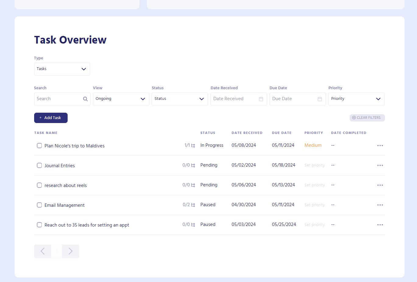 The Tasks filter shows the tasks added by the client or assistants and other details regarding each task. Assistants can play around with the filter to view their desired data per day or per status.