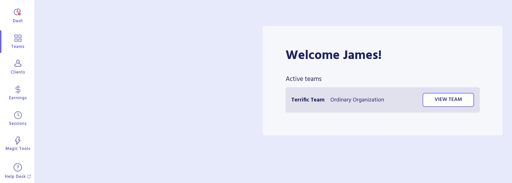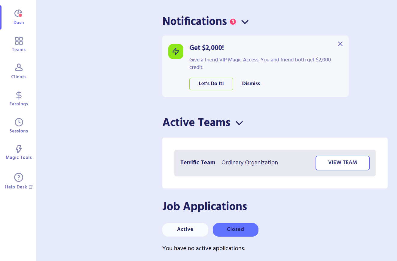 After signing into your Magic Workspace account, a banner will display the Active teams you are part of. A “team” represents a role you are assigned to. If you work with two different clients, you will have two active teams listed on your dashboard.