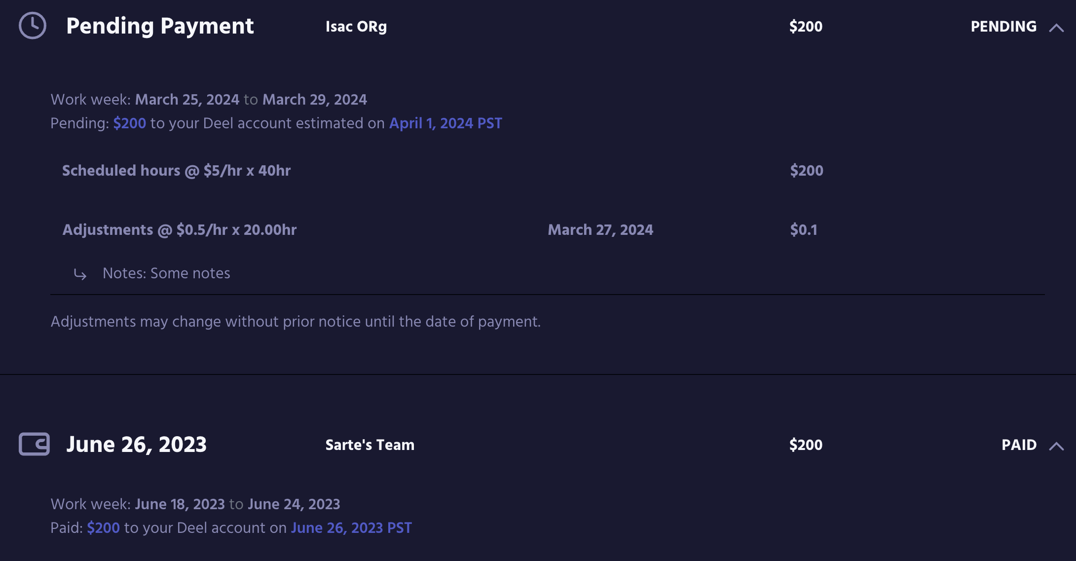 The earnings page shows a breakdown and the expected arrival date of your payout. If your pay has not been issued yet and you need to make changes to your weekly hours, please complete the adjustment form here.
