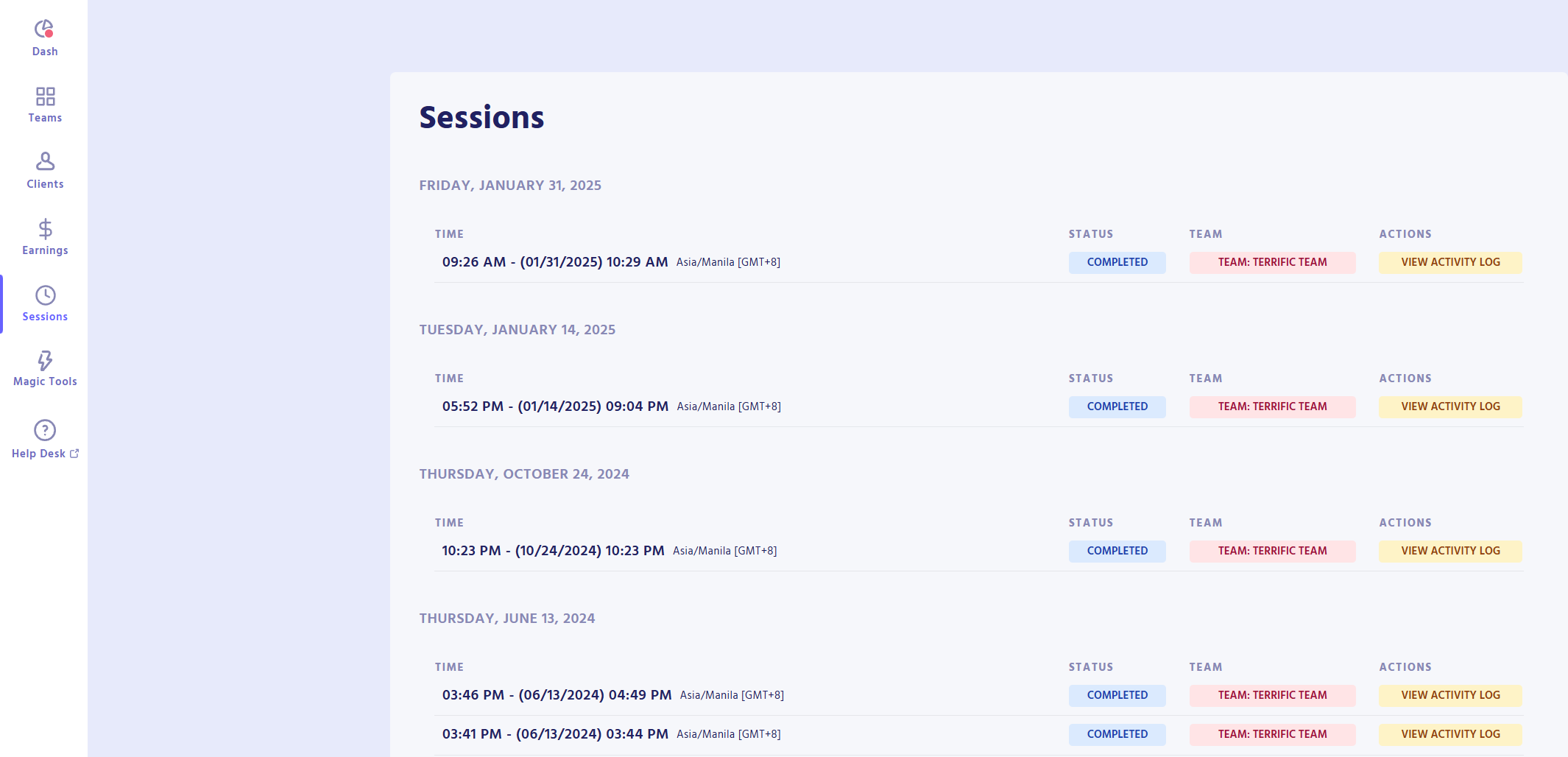 The sessions page displays your clock in/out sessions. This page ensures that every clock in and clock out is recorded and visibly documented for reference.